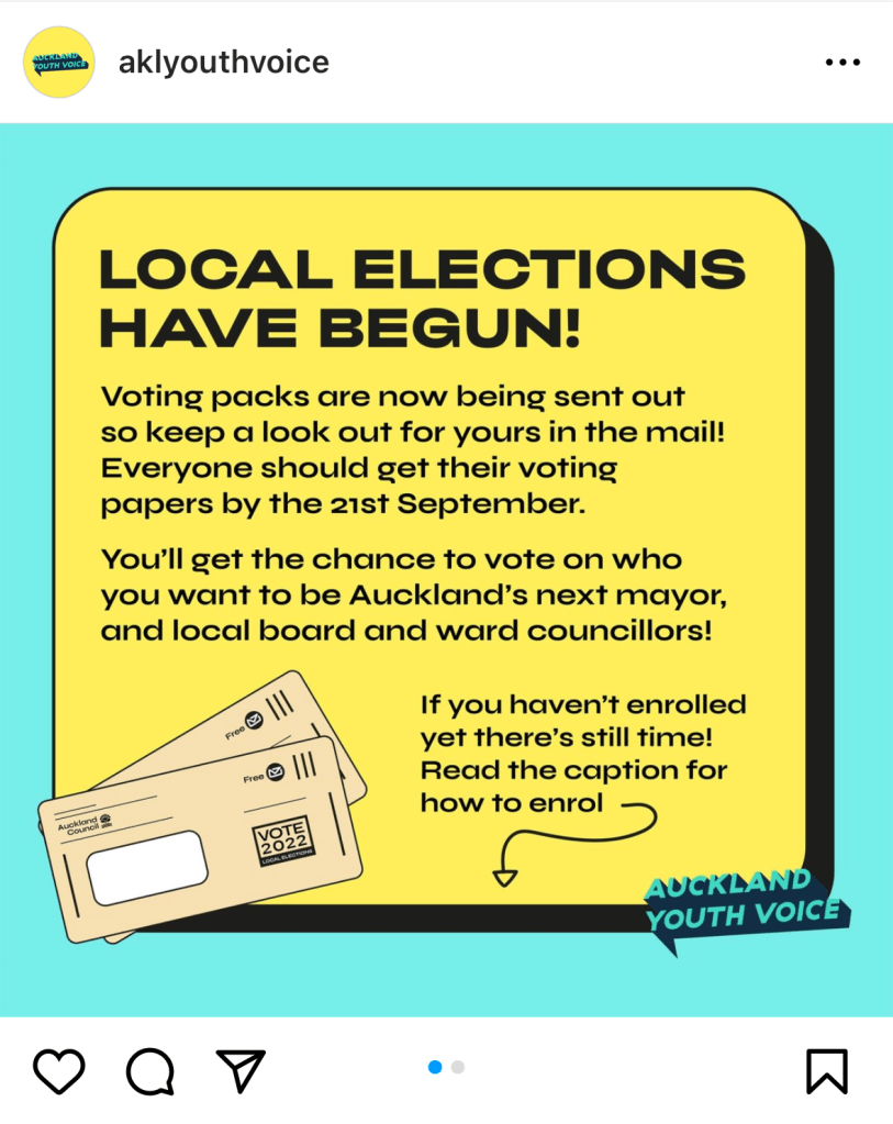 In 2022, a successful informative social media campaign was launched to inform rangatahi about how the elections work and how they can be informed and vote. The campaign reached over 2,400 views and 350 engagements.